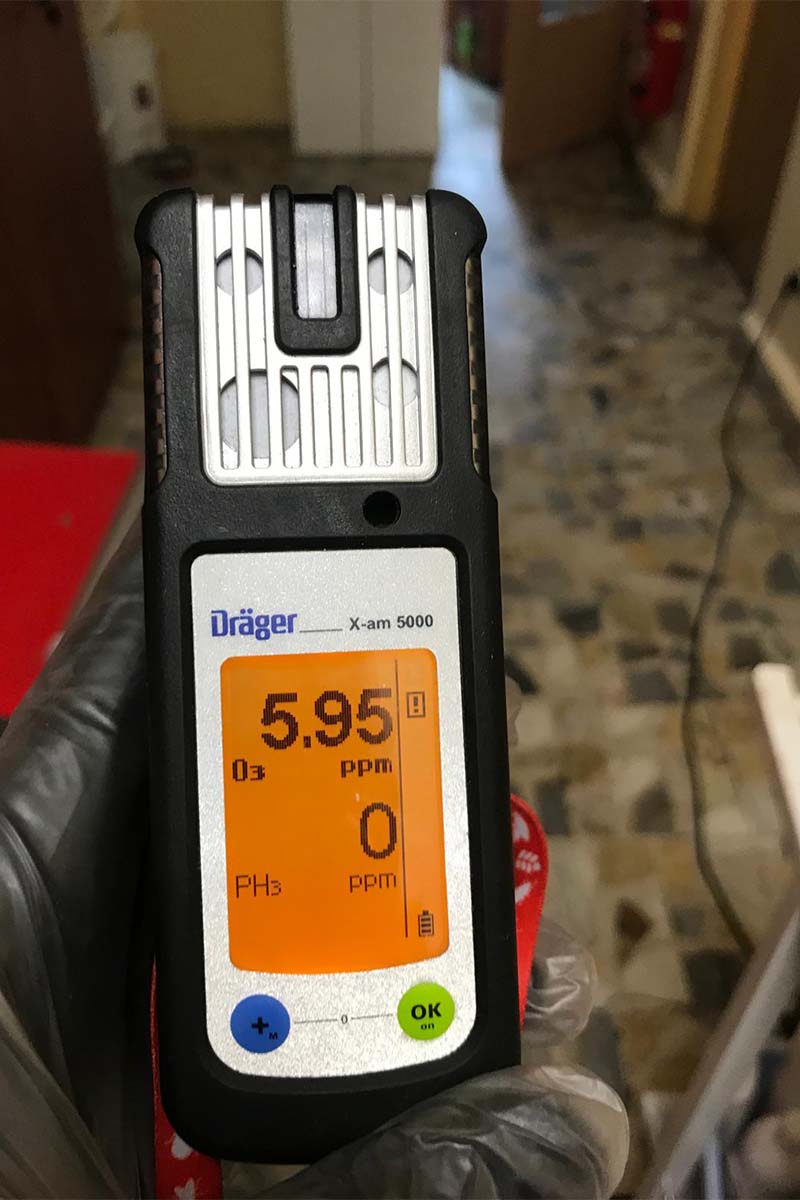 Etap 3: Proces biobójczego ozonowania uruchomiliśmy generatory, rozpoczynając cykl dezynfekcji. Ozon, jako cięższy od powietrza gaz, wypełnił całe pomieszczenie, docierając do każdej szczeliny, porowatej powierzchni ścian i wnikając w strukturę materiałów, gdzie gnieździły się mikroorganizmy. Cząsteczki O3 aktywnie atakowały i niszczyły wirusy, bakterie i grzyby.